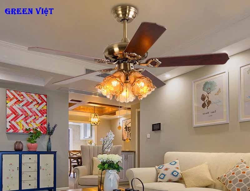 - Cánh quạt gỗ, kết hợp ánh sáng vàng ấm cúng.