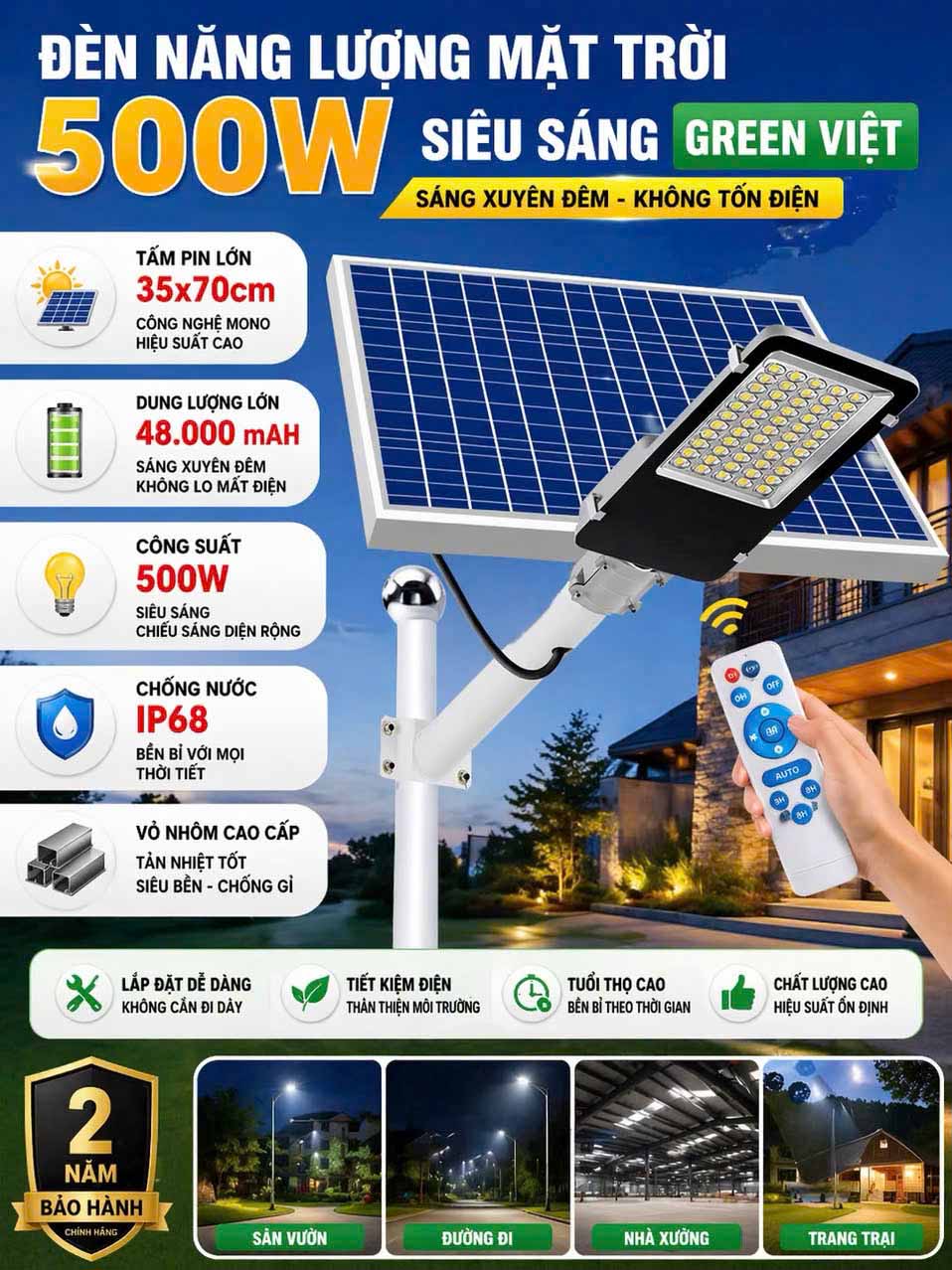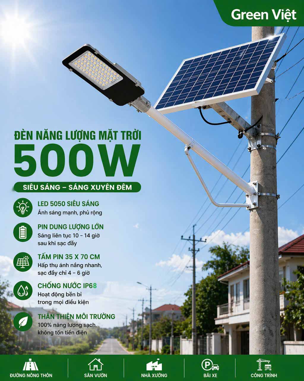 Công ty Green Việt cung cấp mẫu đèn đường năng lượng mặt trời 500W BC500 cao cấp vỏ nhôm tản nhiệt, led siêu sáng, đáp ứng nhu cầu chiếu sân vườn, đường đi, công trình công cộng… cho bạn từ 300- 400m2, chiếu sáng xuyên đêm, mà dùng trên 10 năm không sợ mât đồng tiền điện nào.