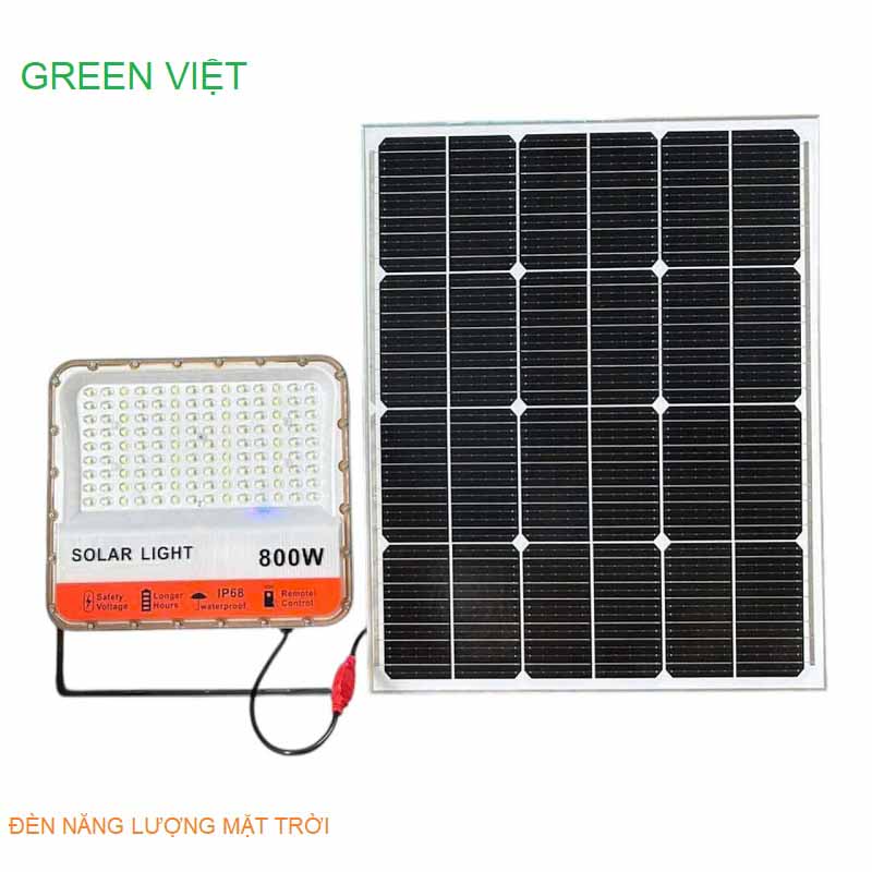 Đèn Led Năng Lượng Mặt Trời 800W GV800 Green Việt sử dụng pin Mono hiệu suất cao, dung lượng lưu trữ lên tới 60.000mAh, cho thời gian chiếu sáng 10–12 giờ liên tục. Với 110 chip LED 5054 siêu sáng, đèn đáp ứng diện tích chiếu sáng lên đến 300m², phù hợp cho mọi không gian ngoài trời. Sản phẩm đạt chuẩn IP68 chống nước tuyệt đối, bảo hành 2 năm, lắp đặt dễ dàng, không cần điện lưới.