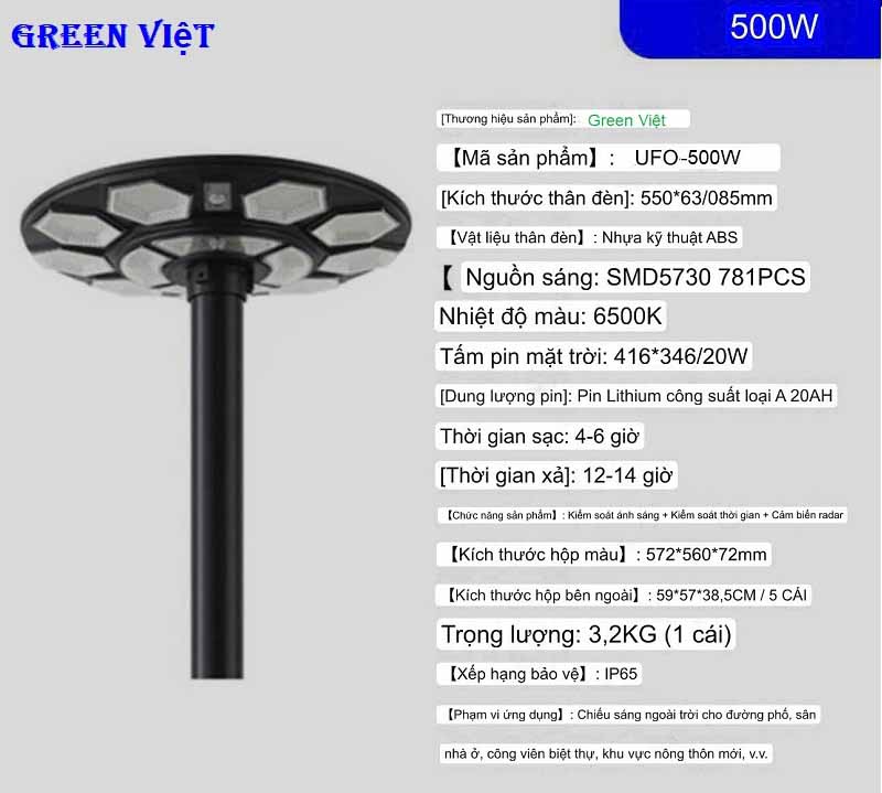 | Công suất | 500W Đèn năng lượng mặt trời UFO-500W |
