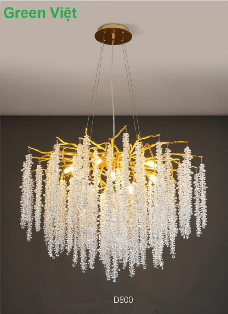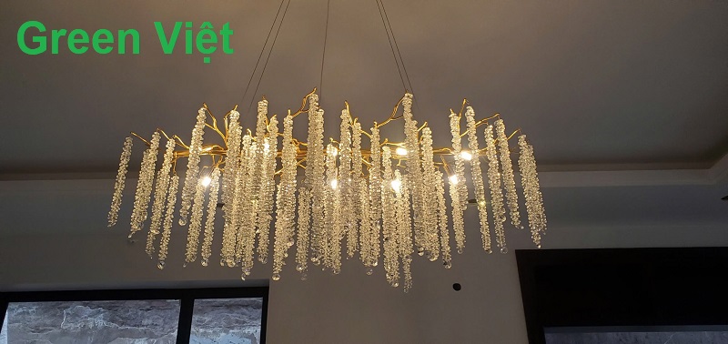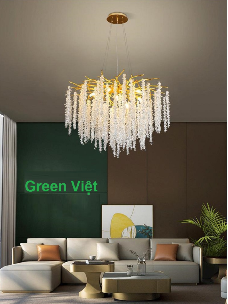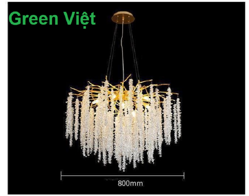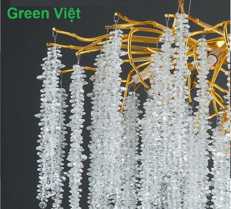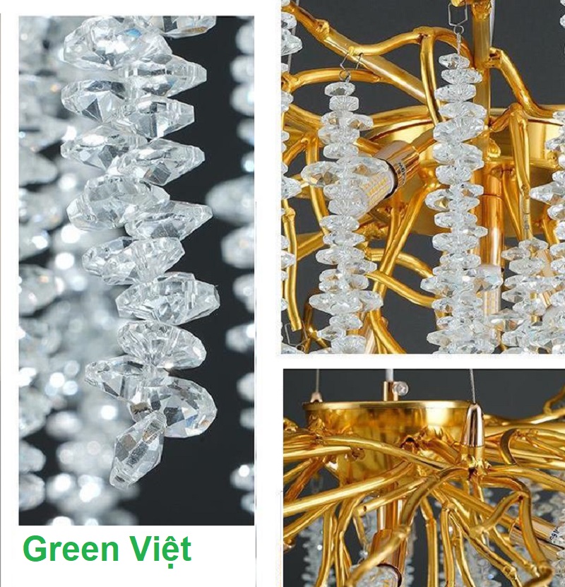 - Chất liệu: Pha lê K9 cao cấp, khung hợp kim không gỉ, mạ vàng sáng bóng.