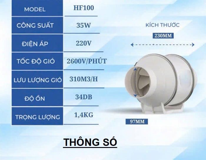 Quạt HGP-100 được trang bị động cơ mạnh mẻ với công suất đạt 100W, đảm bảo hiệu suất hút không khí vượt trội. Lưu lượng không khí có thể đạt tới 200m³/giờ, giúp loại bỏ nhanh chóng mùi khó chịu và duy trì không khí trong lành.