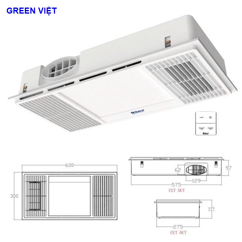 + Chức năng: Dùng gốm Sưởi ấm bán dẫn PTC, thổi gió mát, thông gió hút mùi và chiếu sáng bằng đèn led panel