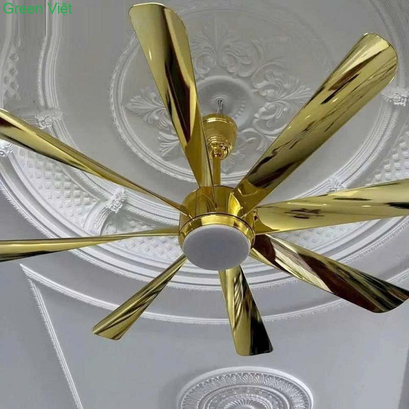 Quạt trần Đèn QTKP157 được phủ lớp màu vàng bóng 18K và 24K, tạo nên vẻ ngoài đẳng cấp và tinh tế. Màu vàng kim loại không chỉ mang lại vẻ đẹp sang trọng mà còn giúp quạt dễ dàng kết hợp với nhiều phong cách nội thất như: