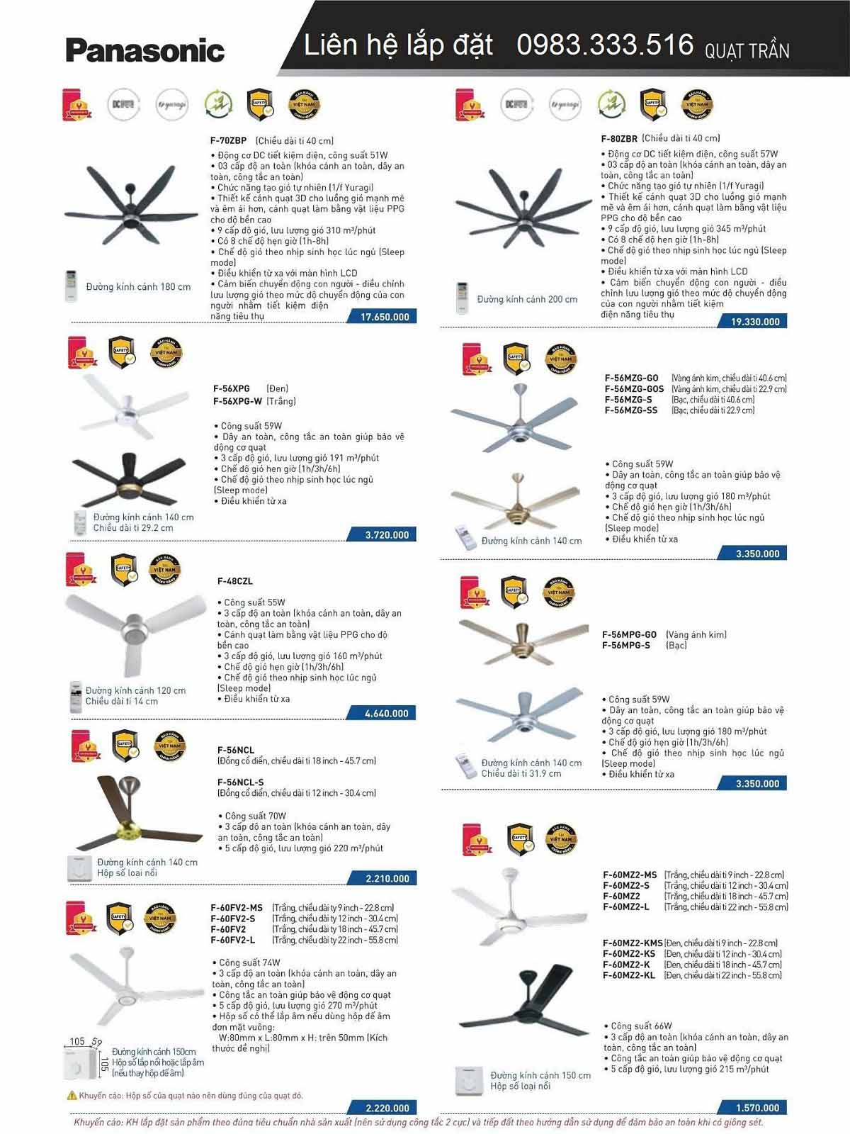 Thông số kỹ thuật quạt trần Panasonic F-60GDS B
